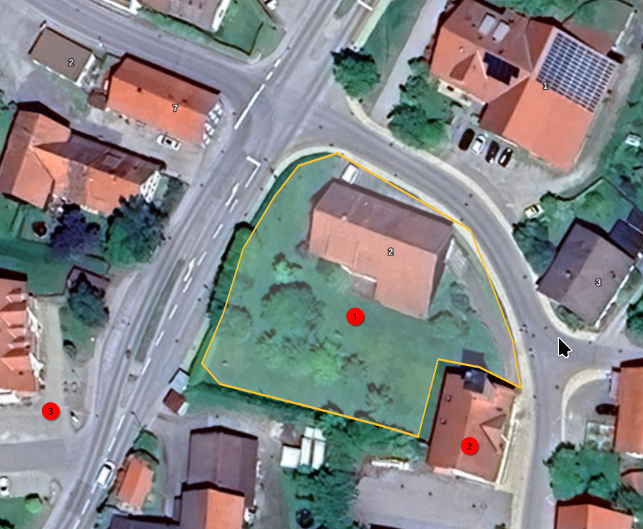 (1) ist in Gelb markierte Dusch-Gelände. Das Grundstück hat eine Fläche von ca. 2600 qm. (2) das Gebäude der Freiwilligen Feuerwehr Börwang. (3) der Dorfladen Börwang.