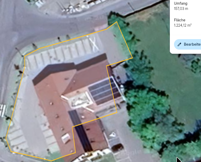 Die benötigte Fläche ist hier schwieriger ersichtlich: Das Gebäude wird nicht nur vom CAP Markt verwendet. Allerdings hat solch eine Mehrfachnutzung auch wiederum andere Vorraussetzungen z.B. mehr Parkplätze für Mieter etc. Man könnte also auch noch wesentlich mehr qm in Betracht ziehen.