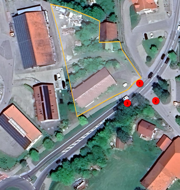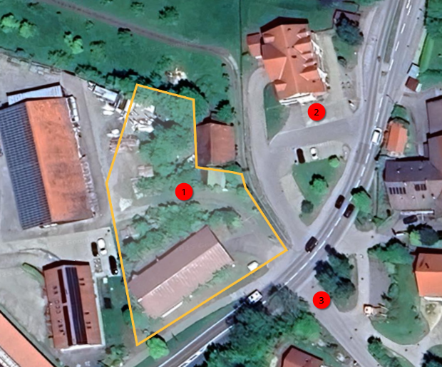 (1) das private Grundstück. (2) der Dorfladen Börwang, (3) Kreuzung St. 2055/Klosterweg.