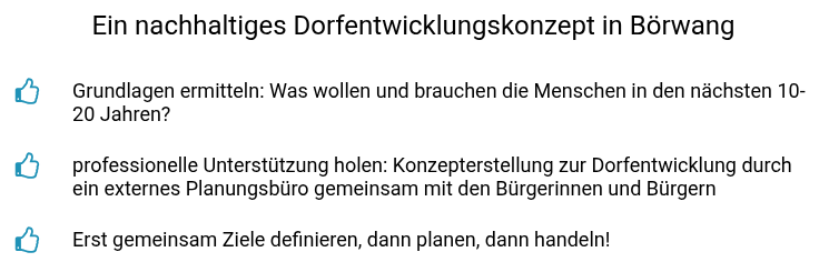 Ohne große Anstrengung werden viele Börwanger Bürger*innen Wünsche vorbringen können, die dann durch professionelle Unterstützung in ein Konzept gepackt werden.